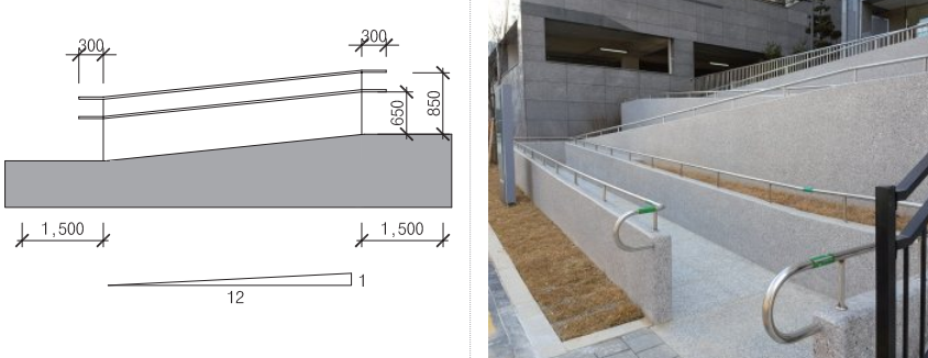 | 나. 기울기 (1) 경사로의 기울기는 12분의 1 이하로 하여야 한다. (2) 다음의 요건을 모두 충족하는 경우에는 경사로의 기울기를 8분의 1까지 완화할 수 있다. (가) 신축이 아닌 기존시설에 설치되는 경사로일 것 (나) 높이가 1미터 이하인 경사로로서 시설의 구조 등의 이유로 기울기를 12분의 1이하로 설치 하기가 어려울 것 (다) 시설관리자 등으로부터 상시보조서비스가 제 공될 것 |