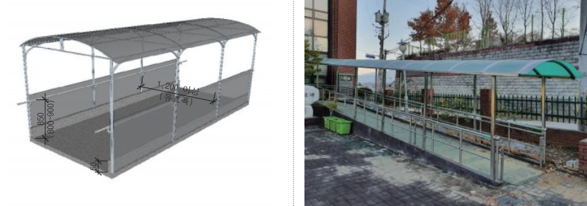 | 마. 기타 시설 건물과 연결된 경사로를 외부에 설치하는 경우 햇볕, 눈, 비 등을 가릴 수 있도록 지붕과 차양을 설치할 수 있다. |