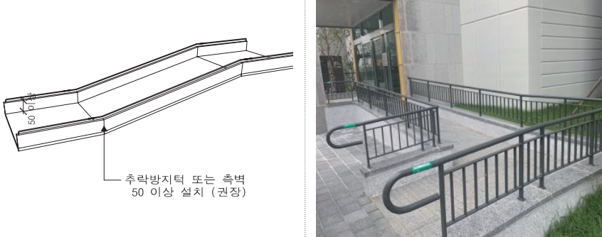 | 라. 재질과 마감 (2) 양측면에는 휠체어의 바퀴가 경사로 밖으로 미끄 러져 나가지 아니하도록 5센티미터 이상의 추락방 지턱 또는 측벽을 설치할 수 있다. (3) 휠체어의 벽면충돌에 따른 충격을 완화하기 위하 여 벽에 매트를 부착할 수 있다 |