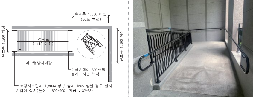 | 가. 유효폭 및 활동공간 (1) 경사로의 유효폭은 1.2미터 이상으로 하여야 한 다. 다만, 건축물을 증축·개축·재축·이전·대수선 또는 용도변경하는 경우로서 1.2미터 이상의 유효 폭을 확보하기 곤란한 때에는 0.9미터까지 완화할 수 있다. |