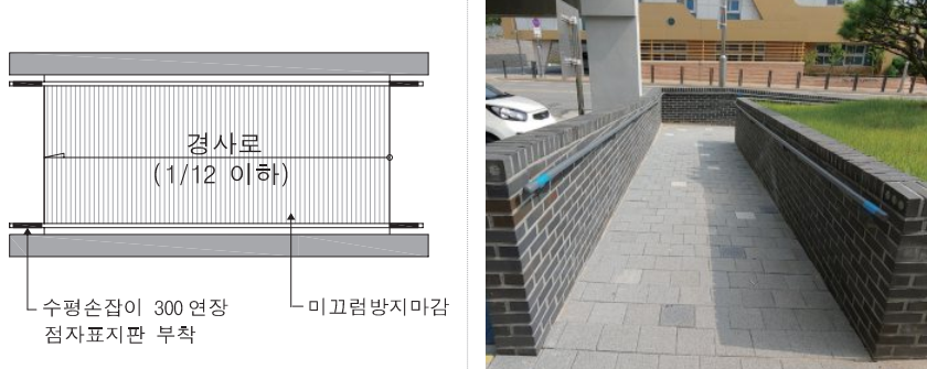 | 다. 손잡이 (2) 손잡이를 설치하는 경우에는 경사로의 시작과 끝 부분에 수평손잡이를 0.3미터 이상 연장하여 설치 하여야 한다. 다만, 통행상 안전을 위하여 필요한 경우에는 수평손잡이를 0.3미터 이내로 설치할 수 있다. (3) 손잡이에 관한 기타 세부기준은 제7호의 복도의 손잡이에 관한 규정을 적용한다 |