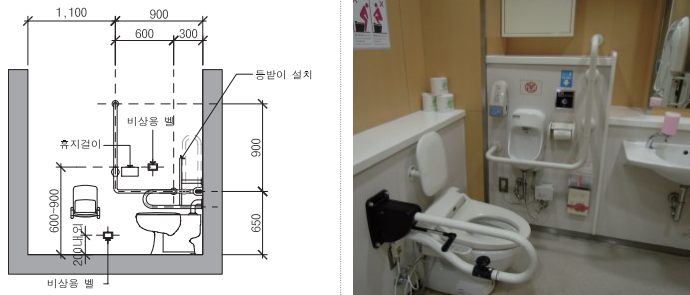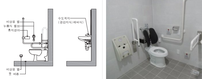 | (다) 공공업무시설, 병원, 문화 및 집회시설, 장애 인복지시설, 휴게소 등은 대변기 칸막이 내부 에 세면기와 샤워기를 설치할 수 있다. 이 경 우 세면기는 변기의 앞쪽에 최소 규모로 설치 하여 대변기 칸막이 내부에서 휠체어가 회전 하는데 불편이 없도록 하여야 하며, 세면기에 연결된 샤워기를 설치하되 바닥으로부터 0.8 미터에서 1.2미터 높이에 설치하여야 한다. (라) 화장실 내에서의 비상사태에 대비하여 비상용 벨은 대변기 가까운 곳에 바닥면으로부터 0.6 미터와 0.9미터 사이의 높이에 설치하되, 바 닥면으로부터 0.2미터 내외의 높이에서도 이 용이 가능하도록 하여야 한다 |