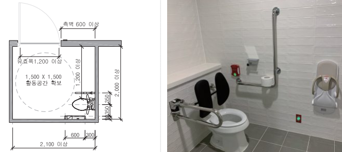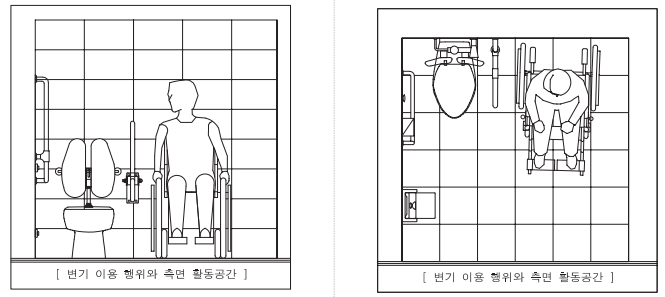 | 나. 대변기 (1) 활동공간 (가) 건물을 신축하는 경우에는 대변기의 유효바닥 면적이 폭 1.6미터 이상, 깊이 2.0미터 이상 이 되도록 설치하여야 하며, 대변기의 좌측 또 는 우측에는 휠체어의 측면접근을 위하여 유 효폭 0.75미터 이상의 활동공간을 확보하여 야 한다. 이 경우 대변기의 전면에는 휠체어가 회전할 수 있도록 1.4미터×1.4미터 이상의 활동공간을 확보하여야 한다. |