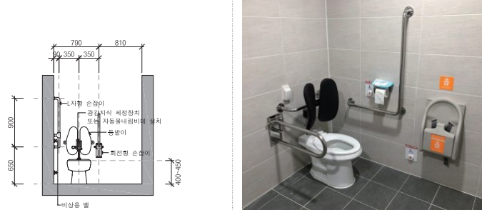 | 나. 대변기 (3) 손잡이 (마) 화장실의 크기가 2미터×2미터 이상인 경우에는 천장에 부착된 사다리형태의 손잡이를 설치 할 수 있다. (4) 기타사항 (가) 세정장치·휴지걸이 등은 대변기에 앉은 상태 에서 이용할 수 있는 위치에 설치하여야 한다. (나) 출입문에는 화장실사용여부를 시각적으로 알 수 있는 설비 및 잠금장치를 갖추어야 한다 |