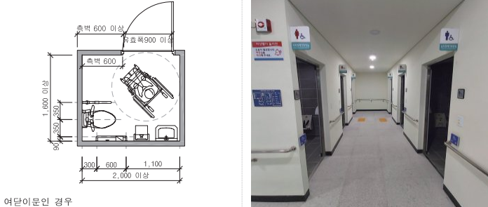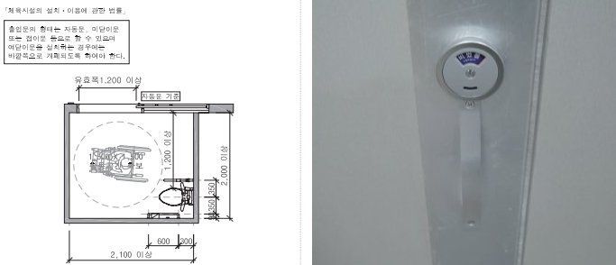 | 나. 대변기 (1) 활동공간 (마) 출입문의 형태는 자동문, 미닫이문 또는 접이 문 등으로 할 수 있으며, 여닫이문을 설치하는 경우에는 바깥쪽으로 개폐되도록 하여야 한 다. 다만, 휠체어사용자를 위하여 충분한 활동 공간을 확보한 경우에는 안쪽으로 개폐되도록 할 수 있다. |