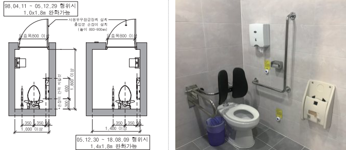 | 나. 대변기 (1) 활동공간 (나) 대변기의 전면에는 휠체어가 회전할 수 있도 록 1.4미터×1.4미터 이상의 활동공간을 확보 하여야 한다. (다) 신축이 아닌 기존시설에 설치하는 경우로서 시설의 구조 등의 이유로 (가)의 기준에 따라 설치하기가 어려운 경우에 한하여 유효바닥면 적이 폭 1.0미터 이상, 깊이 1.8미터 이상이 되도록 설치하여야 한다 |
