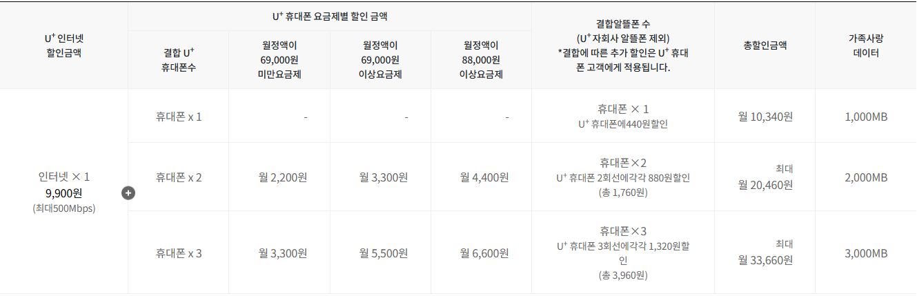 - 휴대폰+인터넷 결합할인(휴대폰은 10대까지, 인터넷은 3대까지 결합 가능)